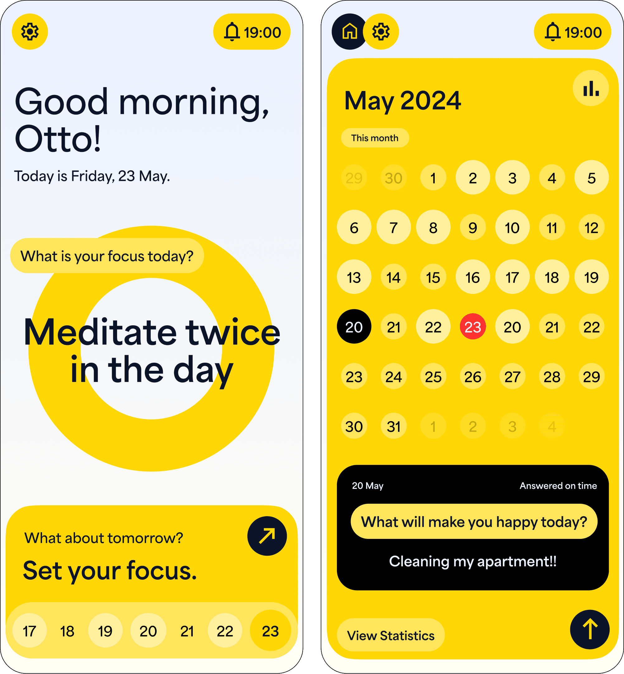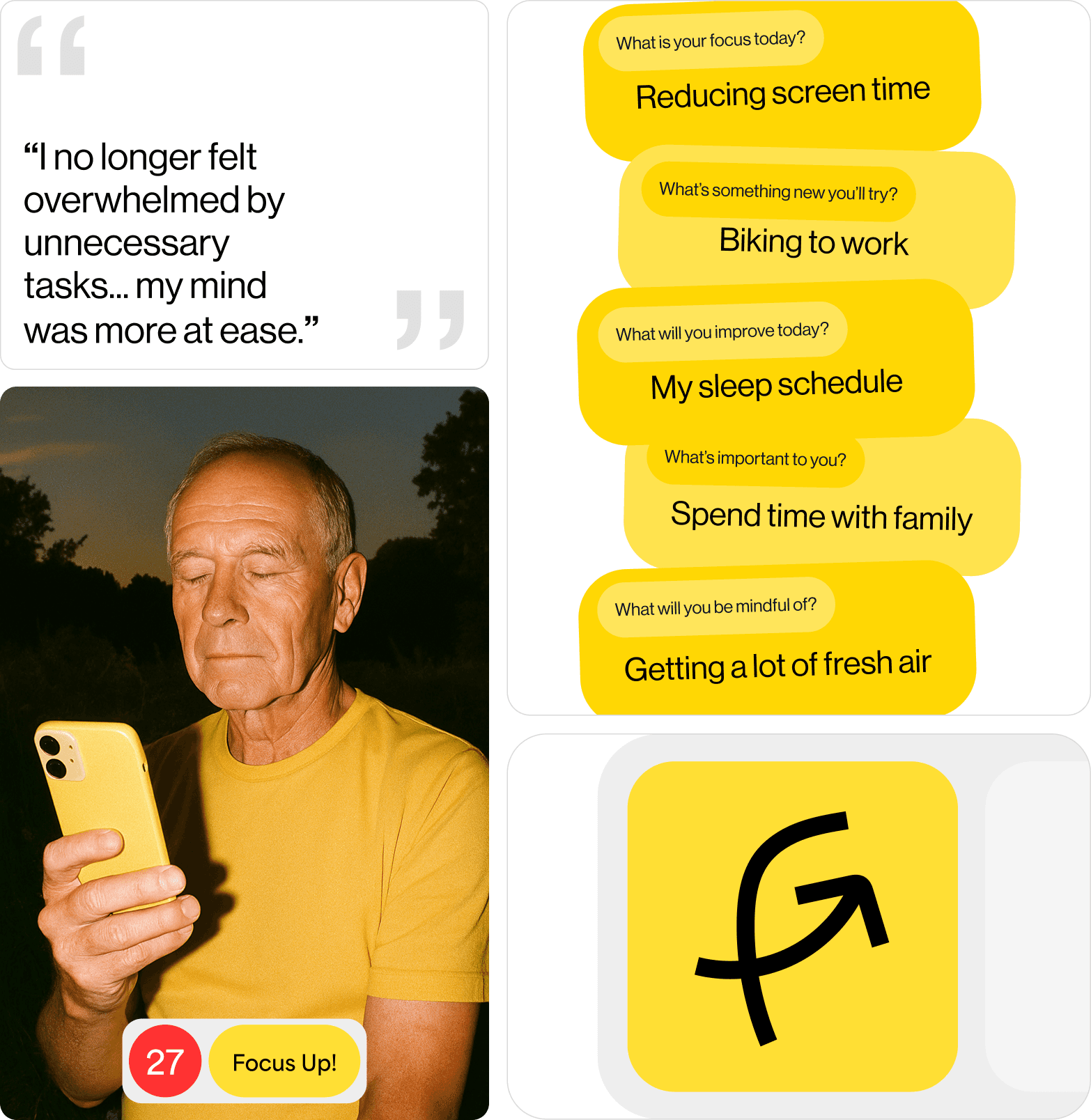 Focus Up! encourages users to pick just one task to focus on a day, rather than overwhelming users with many tasks like traditional productivity apps. Adopting the idea "quality over quantity", it ensures a healthy boost in productivity. The app maintains a feeling of accomplishment and encouragement daily, allowing users to keep track of positive and important events.